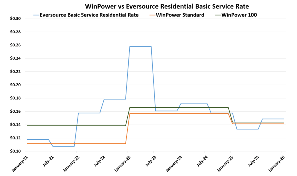 At a time when energy rates are increasing, WinPower provides program participants in Winchester with competitive, fixed rates that will not change for the duration of the term, December 2024 – December 2027. Savings cannot be guaranteed because future Eversource Basic Service rates are unknown.